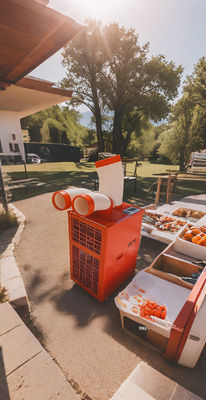 Apresentamos a nossa unidade de ar condicionado portátil com função de drenagem livre, a solução perfeita para manter o ar fresco em vários ambientes exteriores.